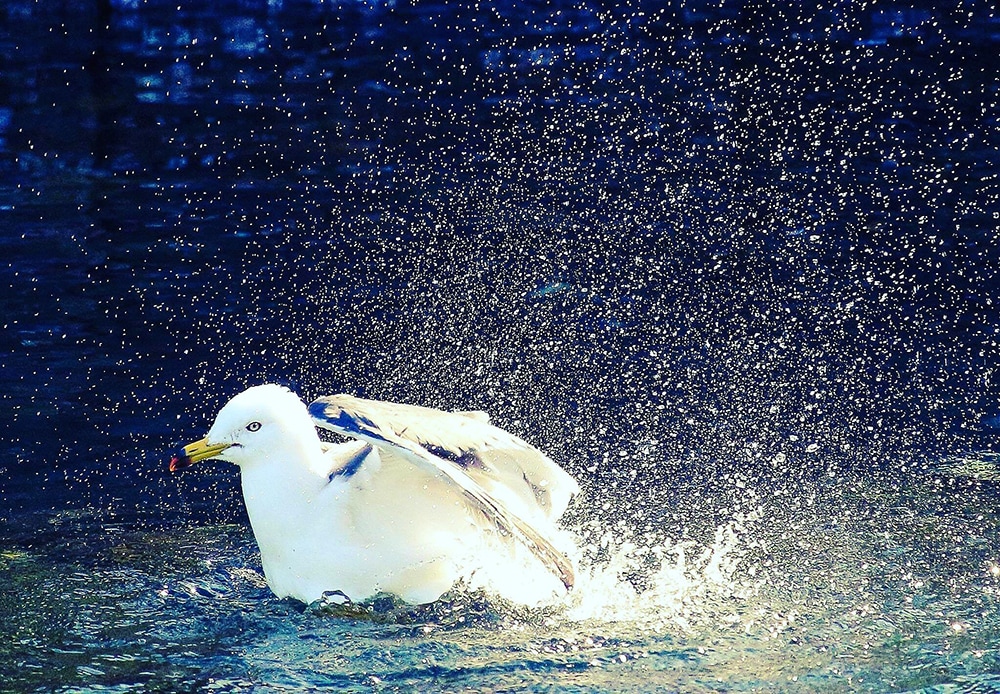 ウミネコと飛沫の写真です。